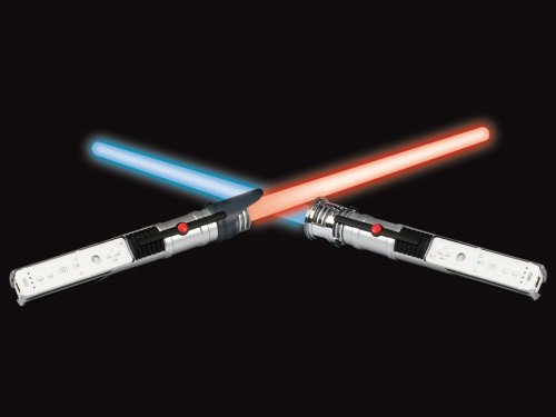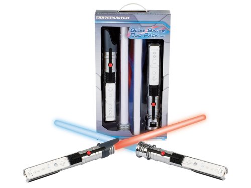 Thrustmaster Glow Sabre Duo Pack for use with the new Star Wars Force Unleashed game for Wii. Pack of (2) glowing laser sabres for easily inserts into your Wiimote. “Laser effect” with lighting system has (17) LEDS in each saber. Effect even works in full daylight! (2) Different Sabres included for duels. (1) sabre lights up in blue and (1) sabre lights up in red. Blades rounded in soft plastic and easily detachable for safe and easy storage. A “Light” button to switch laser effect On or Off to preserve battery life. (3) AA Batteries required (Not Included) will provide 40 Hours of play.