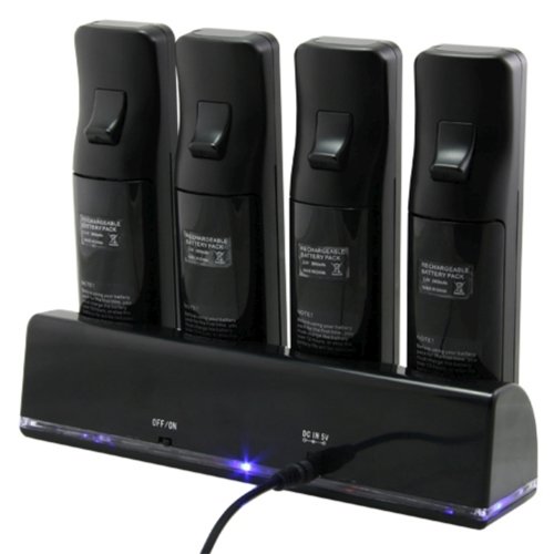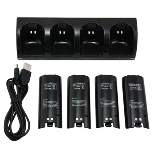 DescriptionBlue Light 4 Dock Charging Station with 4pcs Battery Packs for Nintendo Wii Remote Controller.4 docking ports design is perfect for all 4 of your remote controllers to charge at the same time. Put matched batteries in controller,Dock four of your remote and plug it into any USB port for charging. With on/off power switch, you can turn on/off the outer power without unplug the cable. Include 4pcs 2800mAh rechargeable Ni-MH batteries, simple and convenient to use. The light will turn red when it's in charging ,and it will turn blue when it is fully charged.