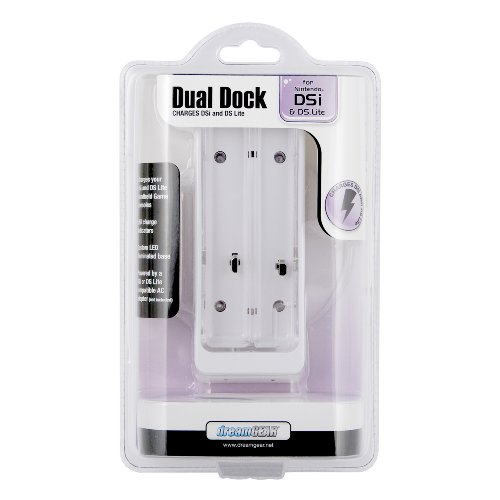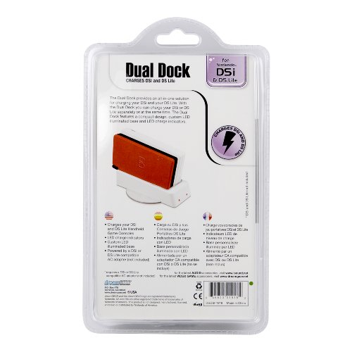 The Dual Dock provides an all-in-one solution for charging your DSi and DS Lite. The Dual Dock allows you to charge your DSi or DS Lite separately or at the same time. The Dual Dock features a compact design, custom glowing base, LED charge indicators and is powered by a DSi or DS Lite compatible AC adapter.