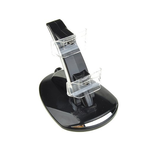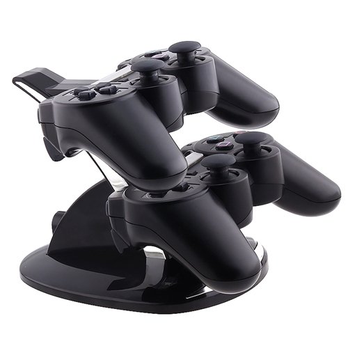 DescriptionFeatures: * Designed for charging the PS3 controllers * Trendy, exquisite yet convenient and secure design * Designed for charging PS3 controllers * Power through USB port from either PS3 or PC * Up to two controllers can be charged simultaneously * Connecting the cable will also allow charging while still being used * Maximum 2 hours for fully charging of one single controller * Distinct dual colored LED light indicator showing charge status – Blue (charging), Green (Charged) Package Contents: 1x Blue LED Dual Charger Controller Stand Features