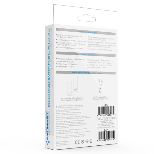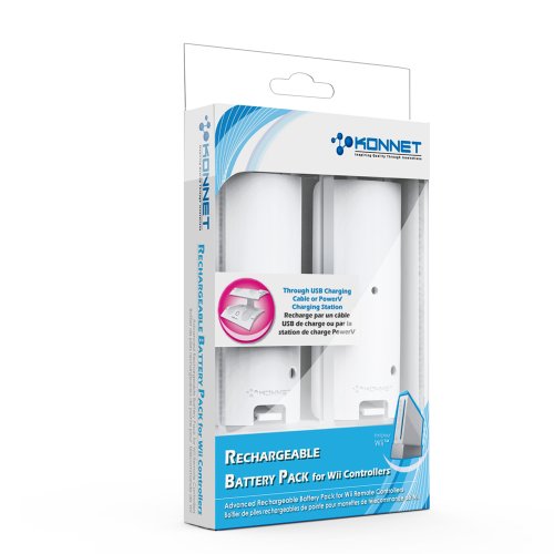 DescriptionRechargeable Battery Pack for Wii Controllers,Advanced Rechargeable Battery Pack to power up your Wii Remote Controllers External Rechargeable Battery for Wii Remote Controller x 2, 2 x 800mAh Ni-MH Rechargeable Battery. Powered by KONNET PowerV Charging Station or USB Connection, Bundle with USB Connection Cable. Specification: Rechargeable Battery : Ni-MH 800mAh. Input Power : 5V 500mA, Output Power : 3V 800mAh, Cable Length : 1 Meter, Charging time: 3-5 hours, Compatible with, Nintendo Wii Remote, PowerV charging station. Includes: Rechargeable Battery Pack x 2, USB Connection Cable x 1, Color: White.