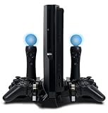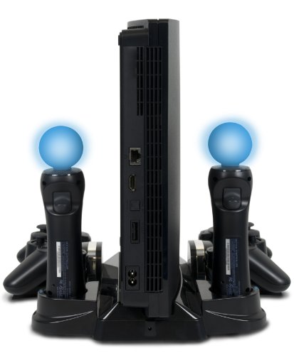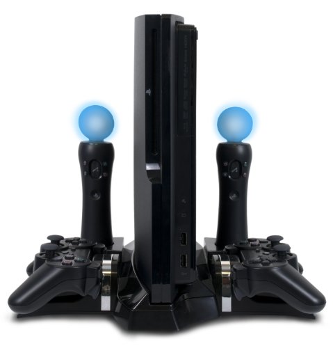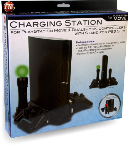 DescriptionTired of that nest of wires and charge stations that surrounds your PlayStation 3 Slim? CTA Digital's PlayStation Move & DualShock Charging Station With Stand For PS3 Slim is your ultimate answer! It efficiently keeps your DualShock 3 controllers and both Move Motion and Navigation controllers organized and out of harm's way, plus securely holds your system upright and in place. At the same time, it recharges every component's internal batteries while being stored. Never worry about cables or occupying ports on the system ever again; simply plug in the included AC adapter and that’s it. Package Includes: (1) Charging station/stand and (1) AC adaptor. Features