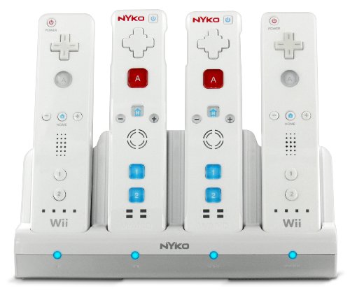DescriptionKeep all of your Wii Remotes charged and ready to go with Nyko’s Charge Station Quad for Wii. The Charge Station Quad includes 4 NiMH batteries, exclusively designed for the Wii Remote, and each providing up to 25 hours of play time. Every battery is easily recharged by placing the Wii Remote in the charging dock. The charging dock conveniently plugs into any standard wall outlet, allowing for rapid recharging of all four batteries simultaneously. The Charge Station includes 4 differently colored custom battery covers with contact pass-through points so you can charge the batteries while they are still in the remote. Each battery cover is also rubberized for superior grip during intense gaming sessions. The Charge Station Quad matches the décor and styling of the Wii, and is perfect for parties, tournaments and family game play sessions. Features