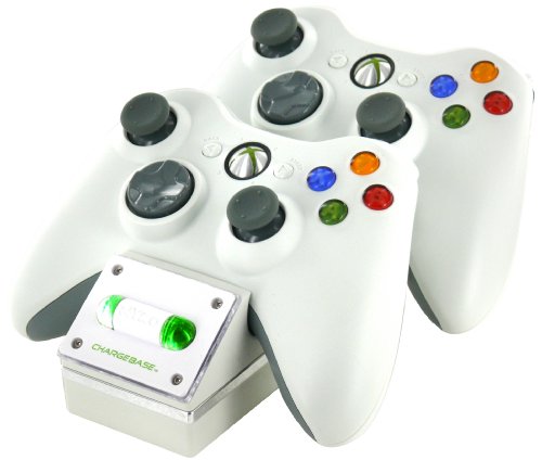 DescriptionConveniently store and charge two Xbox 360 Wireless Controllers with Nyko¿s Charge Base 360. The Charge Base 360 comes with two custom NiMH rechargeable batteries that feature special contact points allowing for an easy drop-in and charge power solution for your wireless controllers. The dual port recharging dock is AC powered, and plugs into any standard outlet, requiring no cables back to the 360 console. Each rechargeable battery powers the wireless controller for up to 25 hours, and charges a single battery in 2 hours, or both batteries simultaneously in 4. The Charge Base 360 is the ideal charging solution for all Xbox 360 owners. Features