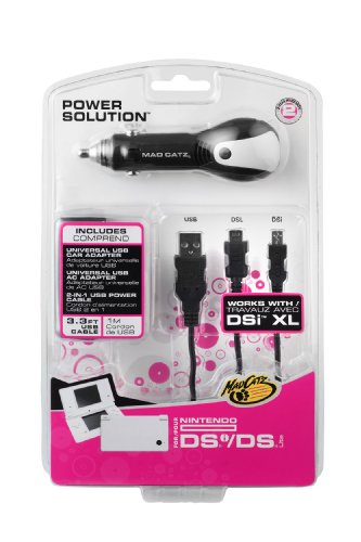 DescriptionKeep the game alive with Mad Catz' Power Solution for the Nintendo DS, DSL, DSi, DSi XL and 3DS. Comprised of an AC adapter and a Car adapter, just plug into an appropriate power source for continuous gameplay, web browsing, audio playback or photo viewing. The included 2-in-1 USB Data/Power Cable lets you power up and charge a multitude of handheld devices via USB. Compact and lightweight, you'll never be without precious battery life for your Nintendo handheld whether at home or on the road. Features