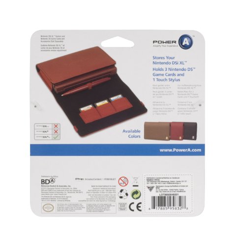 DescriptionThis sleek and functional System Wallet with an elastic band closure fits the Nintendo DSi XL perfectly. Separate fabric-lined compartment provides security for the system and includes storage for 3 Nintendo DS Game Cards and 1 touch stylus (not included). Carry it easily in any lifestyle bag – briefcase, backpack, purse, and more. Available in Burgundy, Black, and Dark Brown. Officially licensed Nintendo product developed by POWER A. Nintendo DSi XL game system, games, and accessories sold separately. Features