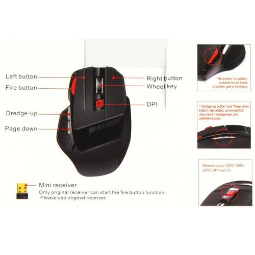 DescriptionThis mouse is compatible with Windows 98SE/ME/2000/XP/Vista/7. The wireless transmission can reach up to 10 meters barrier-free distance. It's a good choice for entertainment, mainly designed to play games. 7 buttons – left button, right button, fire button, wheel key, dredge down, page down, dpi. Also, it's quite comfortable in hand with proper weight. We'll also send a receiver with this mouse. Please use this one, as the fire button function will only be activated by the original receiver. Package Includes: Features