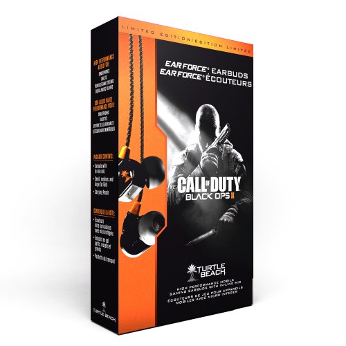 The Turtle Beach Call of Duty®: Black Ops II Ear Force Limited Edition Earbuds put you in control while on the go. Perfect for use with smart phones, tablets and portable gaming devices, the Call of Duty®: Black Ops II Limited Edition Ear Force Earbuds boast a handy multi-function button to control your devices and an around-the-ear cord for enhanced stability and comfort. Premium 10mm drivers provide dynamic audio range and noise-isolating design blocks out ambient noise. Three different ear gel sizes and rugged braided cabling in special Black Ops II colours give you the optimum fit and durability you need while travelling. A gold-plated 4-pole 3.5mm plug makes it compatible with most smartphones and tablets, including the many Apple and Android products, as well as popular portable gaming devices like Nintendo 3DS™ and Sony PlayStation® Vita. The package also includes an adaptor for full functionality on Nokia products.