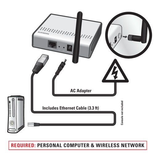 Wireless network at home but no means to connect your Xbox 360 or PlayStation 3 to the Internet? Problem solved with the Wireless Gaming Adapter from Mad Catz. Just plug into a PC—with the included Ethernet cable—for a quick and easy configuration process then plug directly into your console’s Ethernet port to let the online gaming, downloading, and movie viewing begin. Take advantage of the fastest Wireless-N Internet speeds that enable up to 7 times faster game play, for an unrivaled gaming experience. Fully compatible with 802.11 b/g/n wireless Routers and Access Points, now you can take advantage of your console’s Internet capabilities without the need for an expensive first-party accessory.