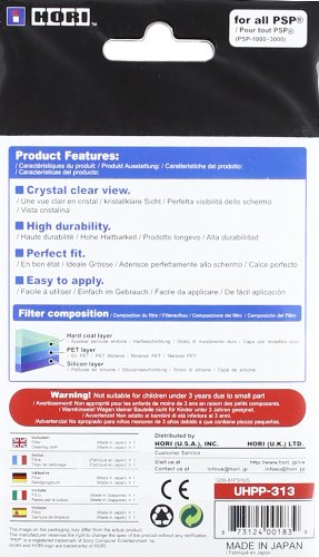 DescriptionNew screen filter for the PSP. Crystal clear view perfect for high quality LCD PSP-3000. Filter is compatible with all PSP systems. (PSP-1000~3000) The protective filter is scratch resistant and protects from getting dirt and scratches. Easy to apply. Features
