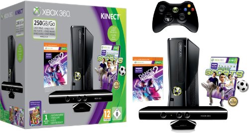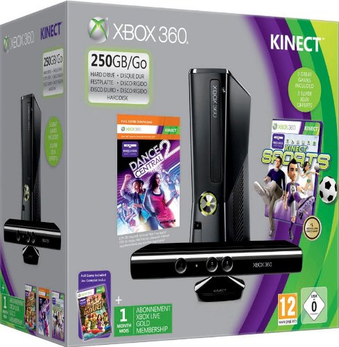 Console Xbox 360 250 Go + Capteur Kinect + Dance central 2 (jeu Kinect) + Sports (jeu Kinect) + Kinect adventures ! + Carte Xbox Live 1 mois by Microsoft