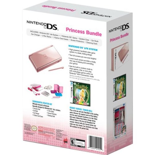 Get her what she really wants. The Nintendo DS Princess Bundle features everything a girl needs to game on the go. Nintendo DS Princess Bundle Includes: Nintendo DS Lite system – Metallic Rose, Disney Fairies: Tinker Bell DS game, Fashionistas DS Bag, Earbud Headphones for Nintendo DS, Car Charger/Adaptor, Screen Protector, Two DS Styli, Two Game Card Covers, Cleaning Cloth.